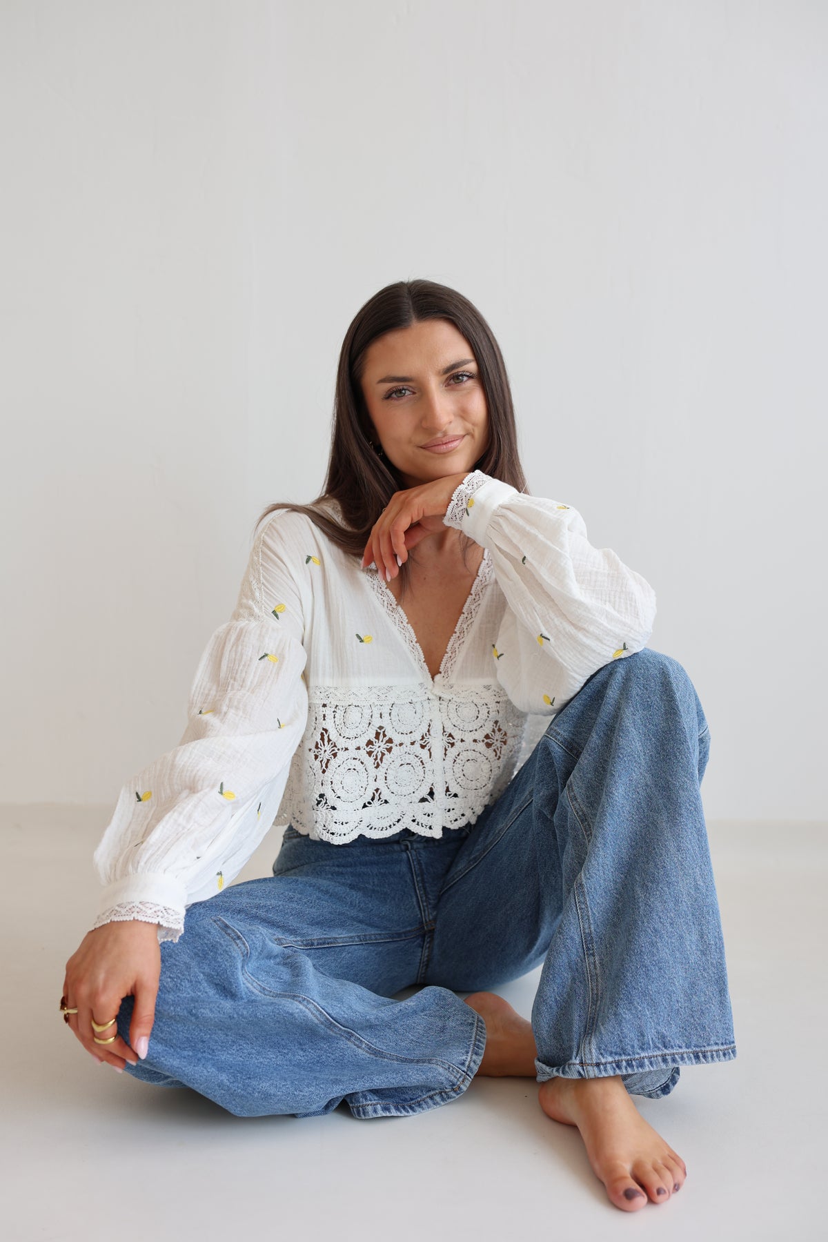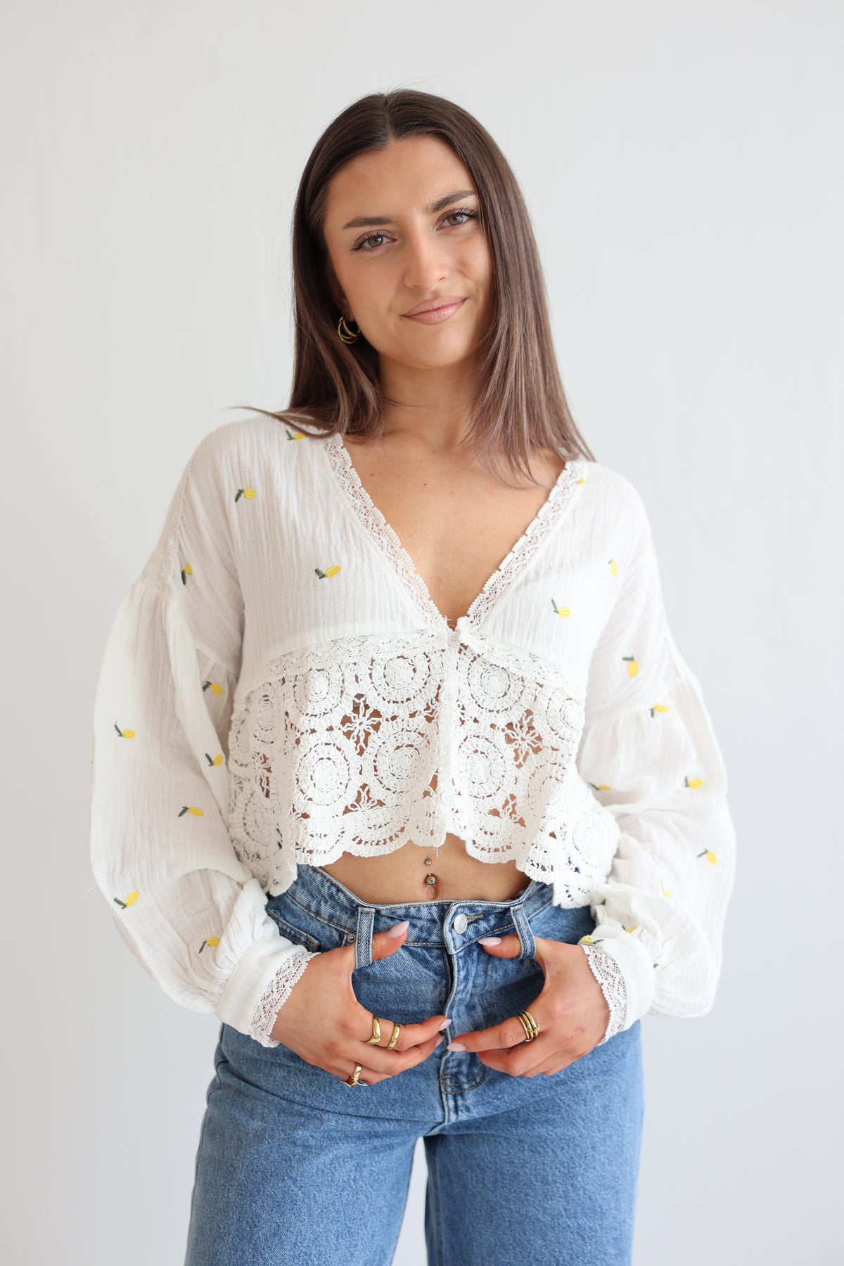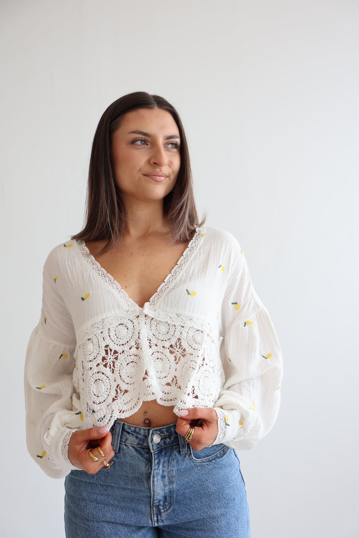 • Cropped Bluse mit Spitze und Zitronenprint