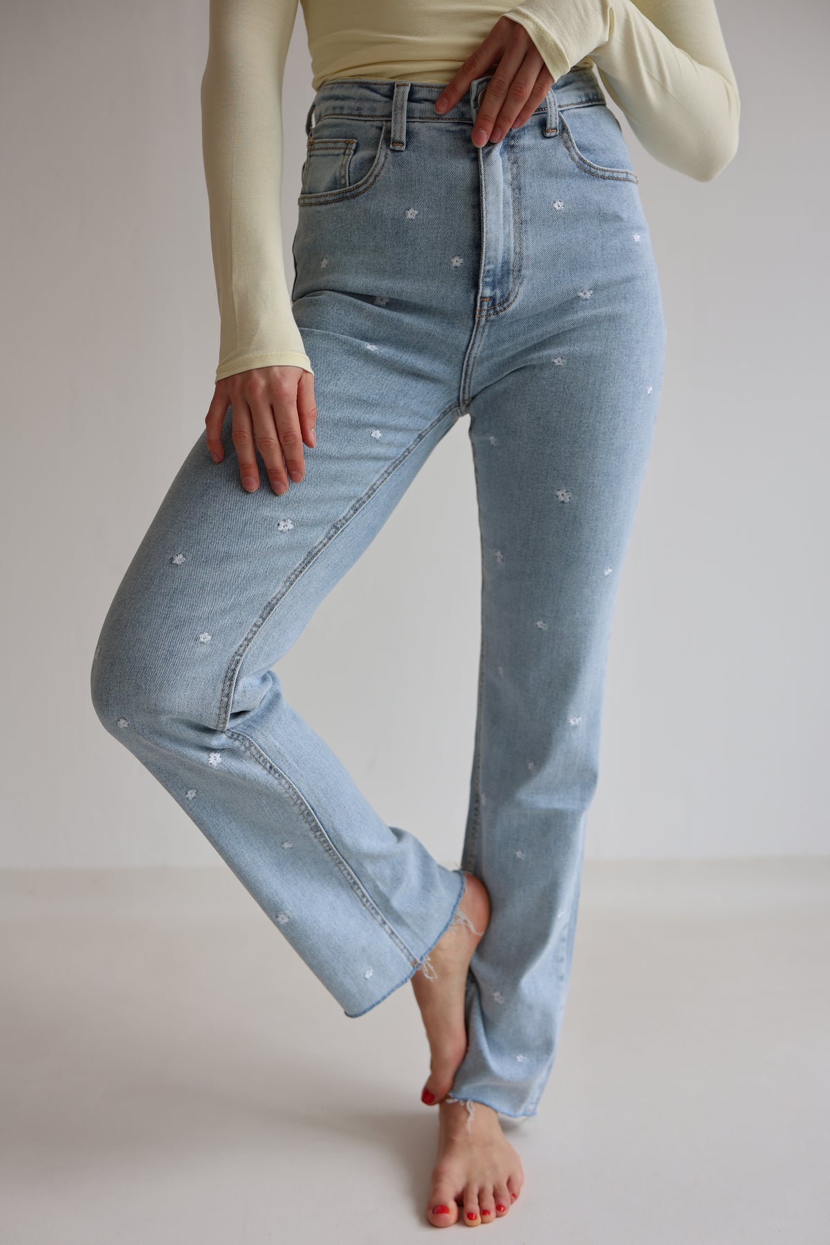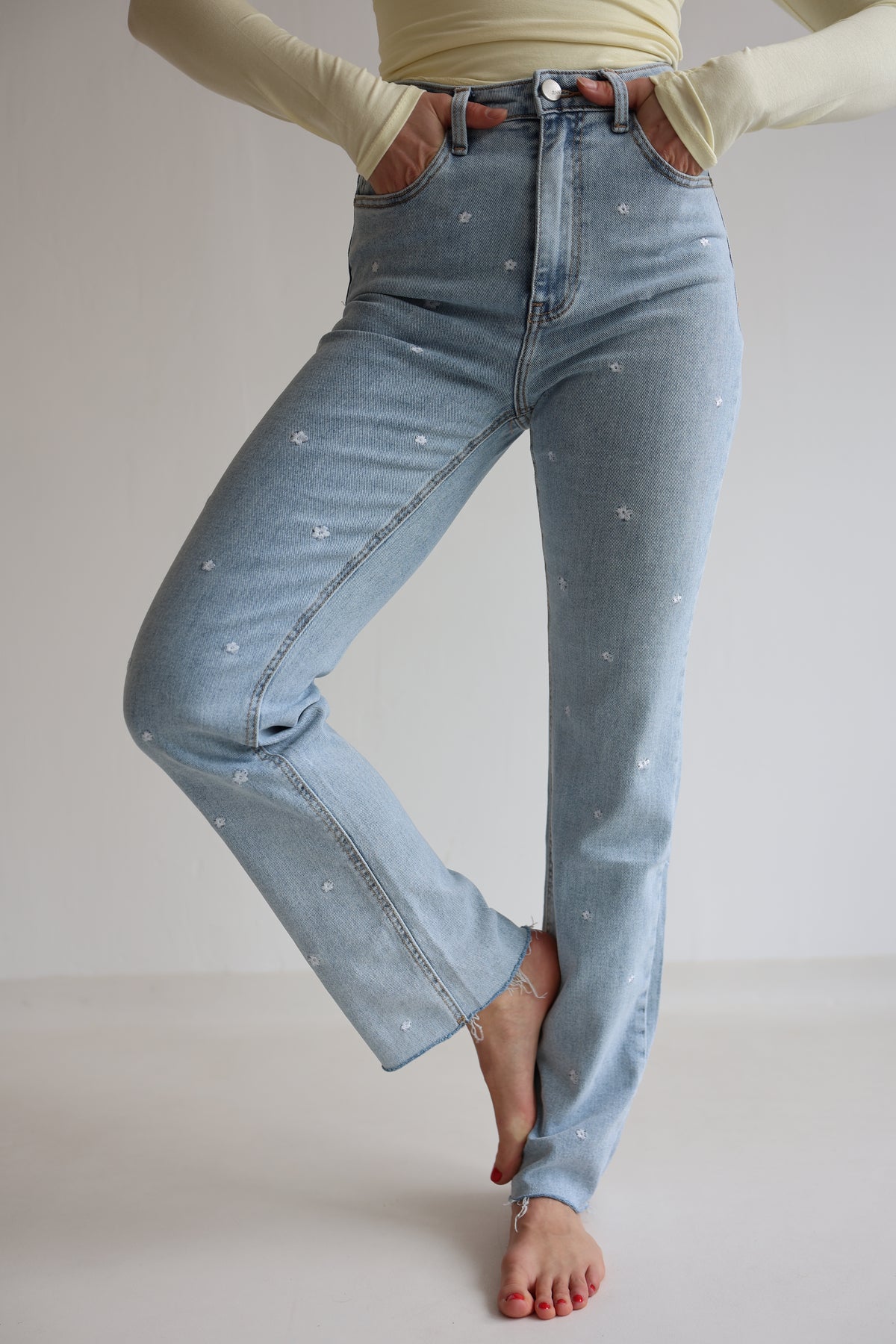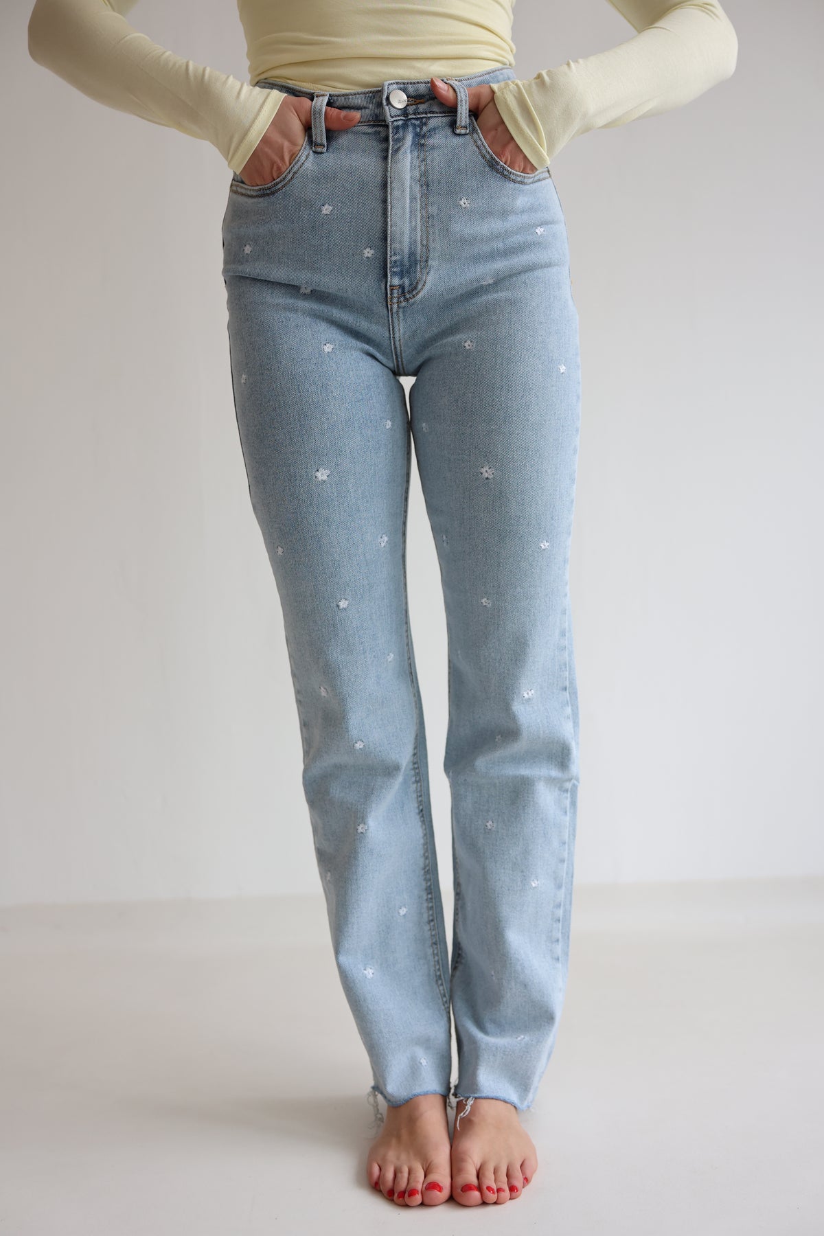 • super bequeme Jeanshose mit kleinen aufgenähten Blumen in weiß