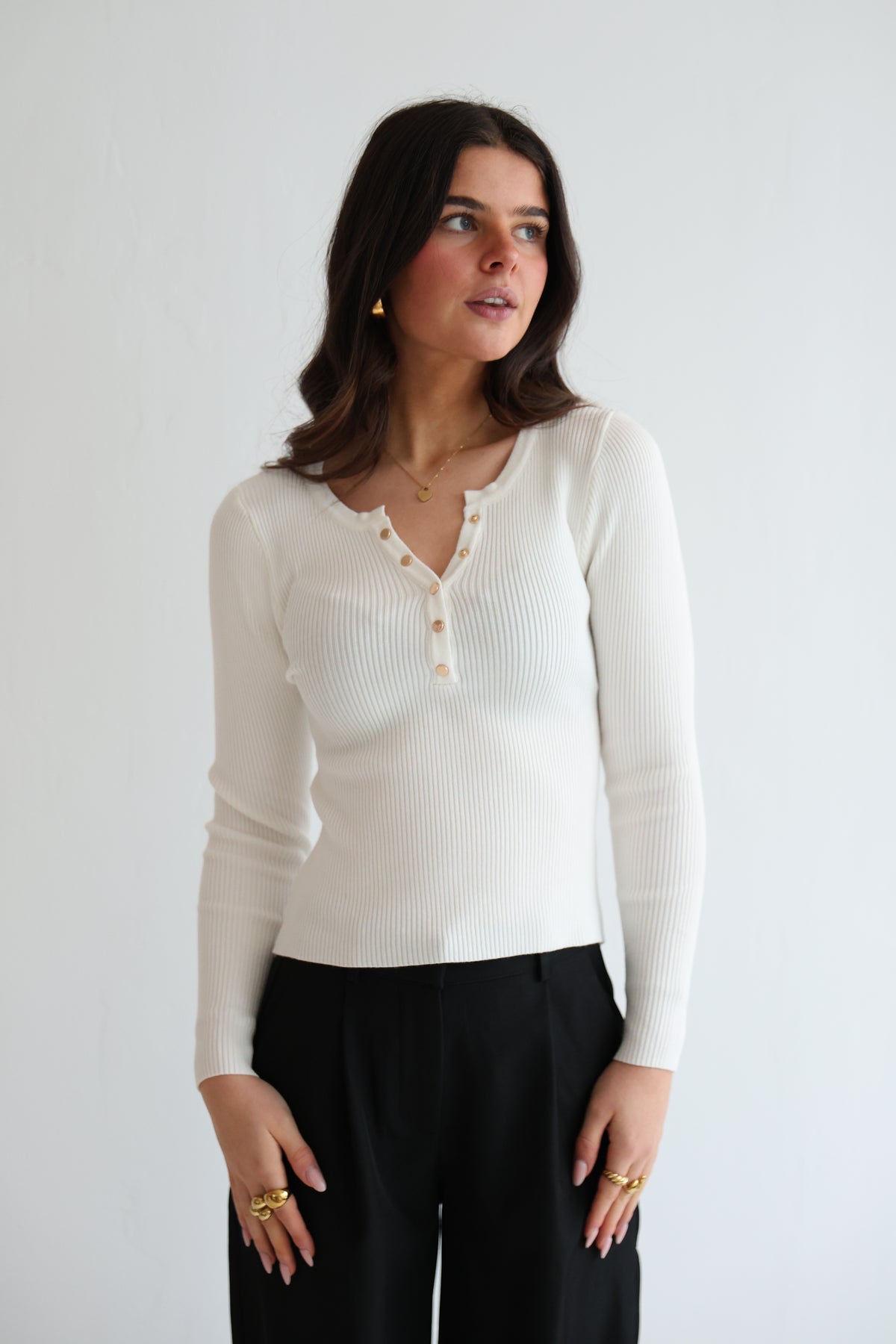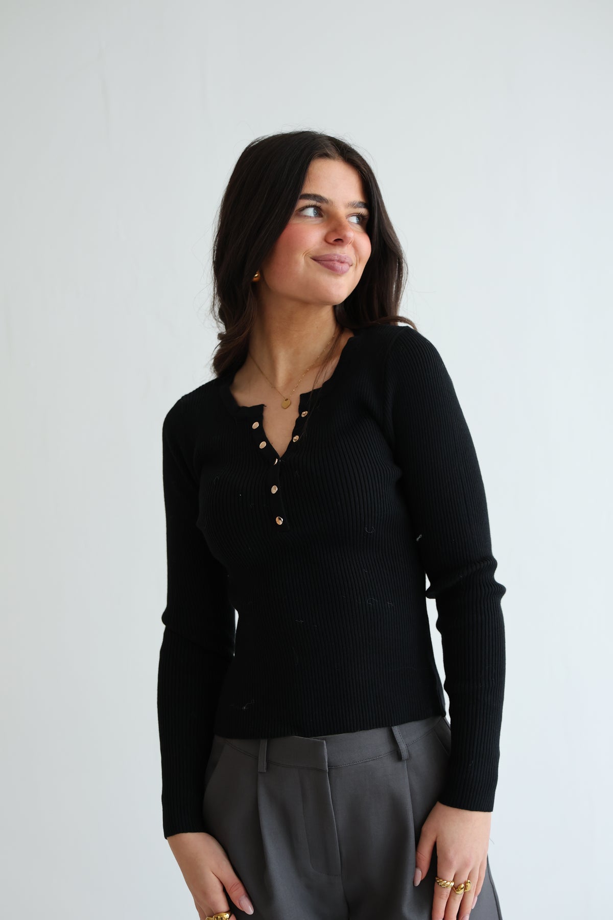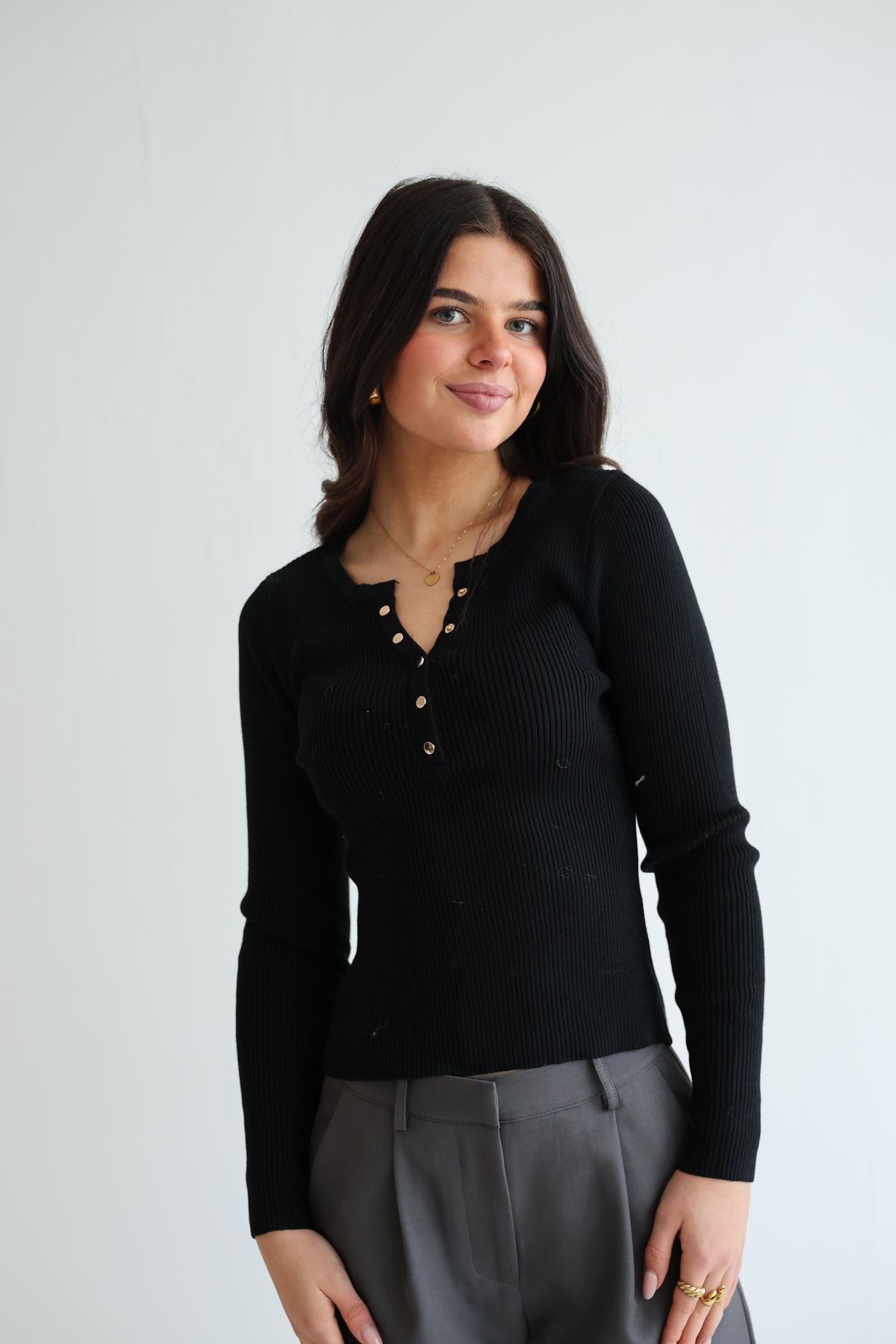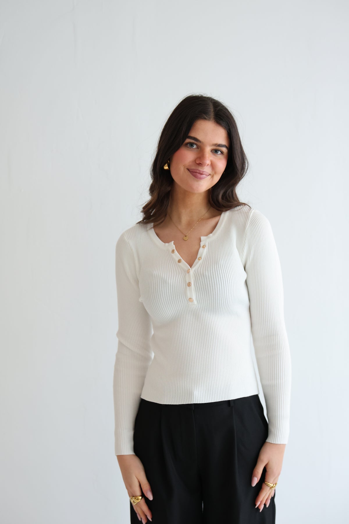 • geripptes Langarmshirt mit Druck-Knopfleiste in Gold