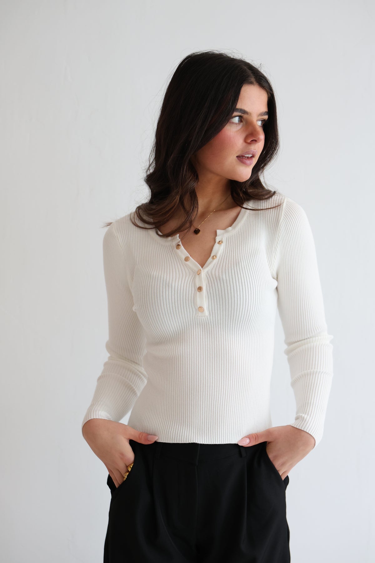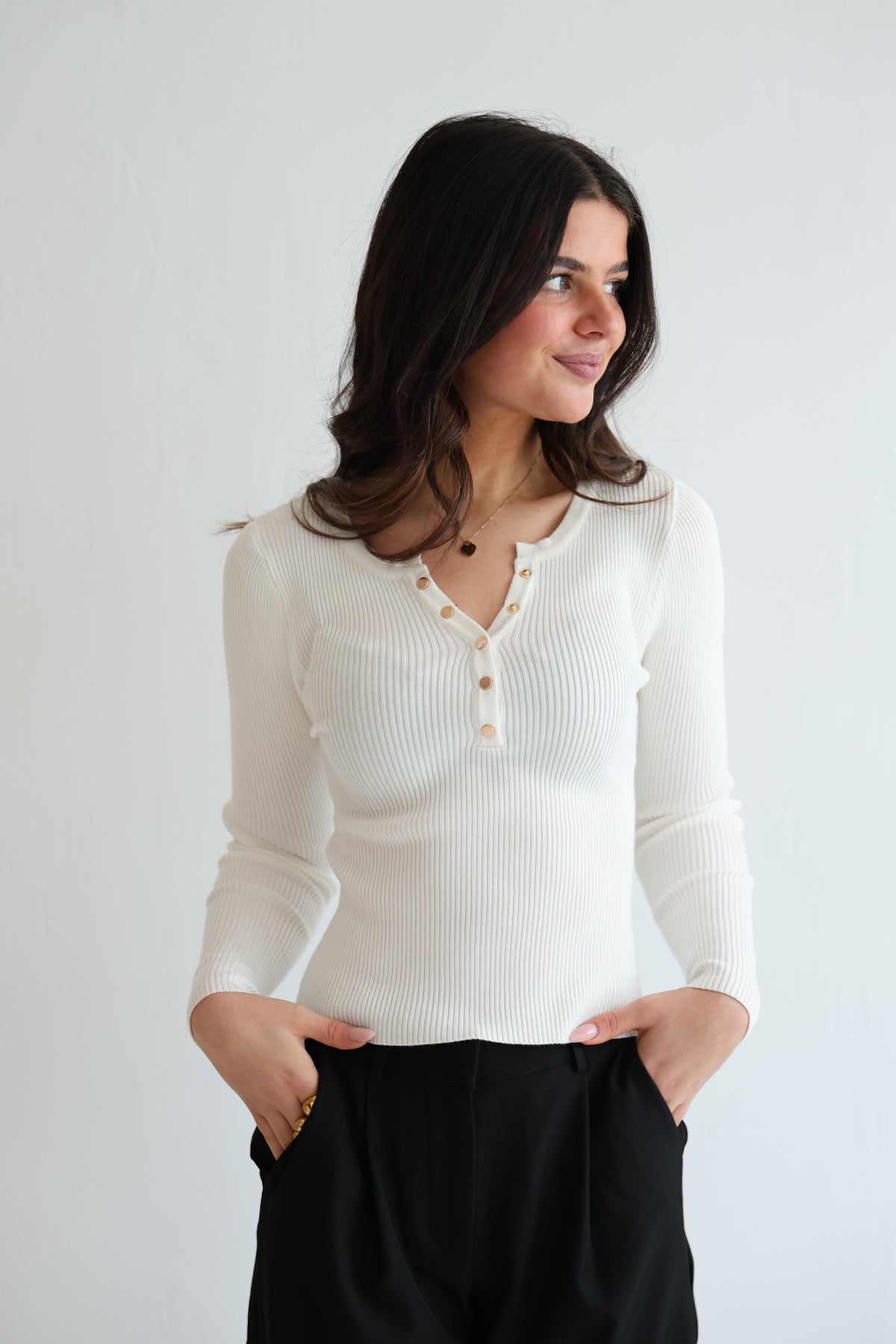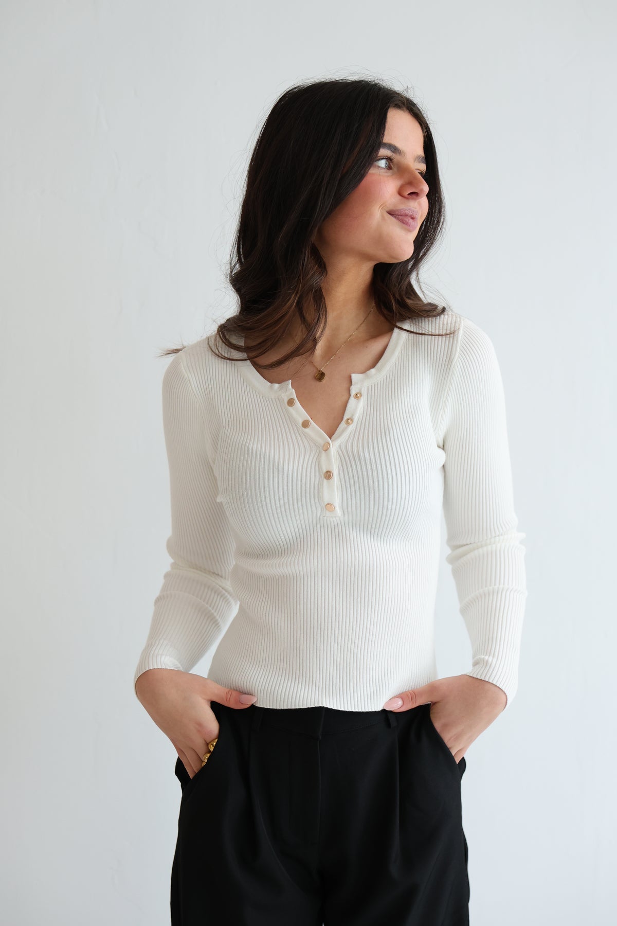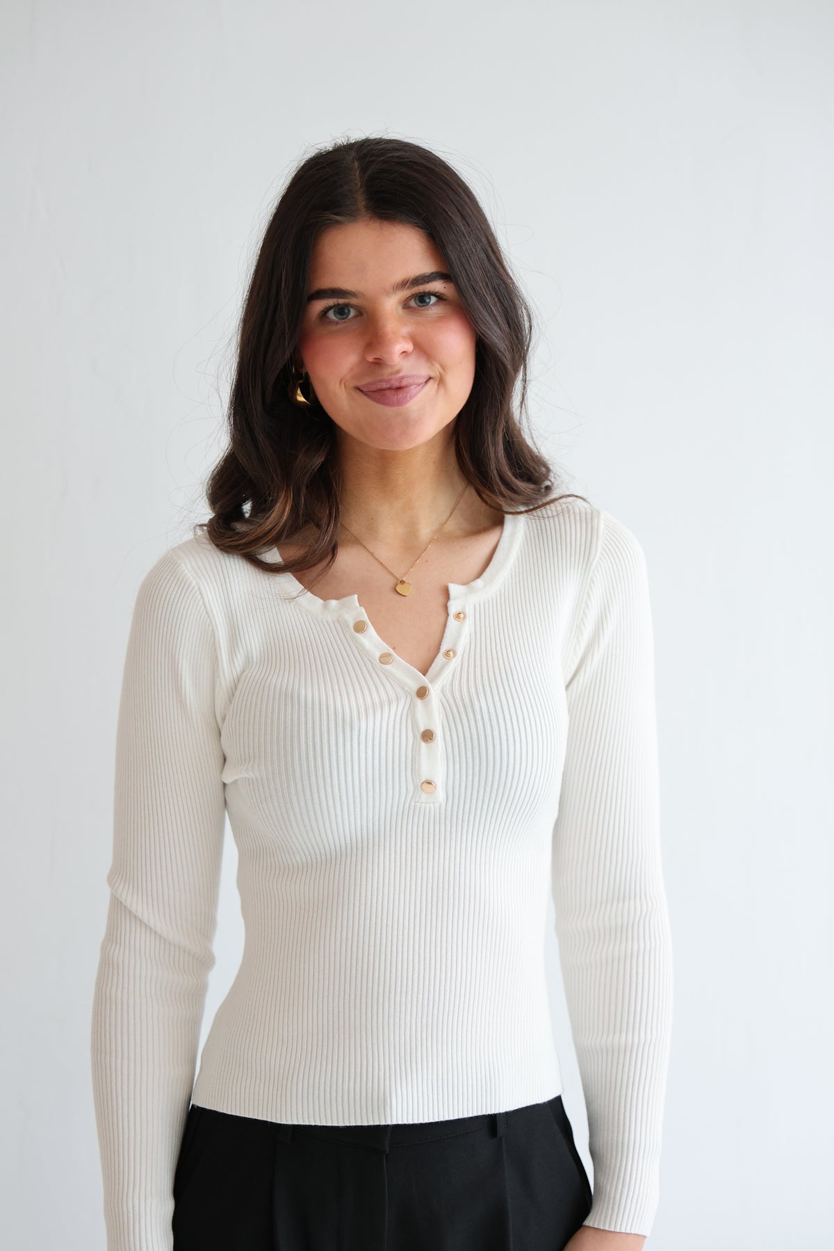 • geripptes Langarmshirt mit Druck-Knopfleiste in Gold