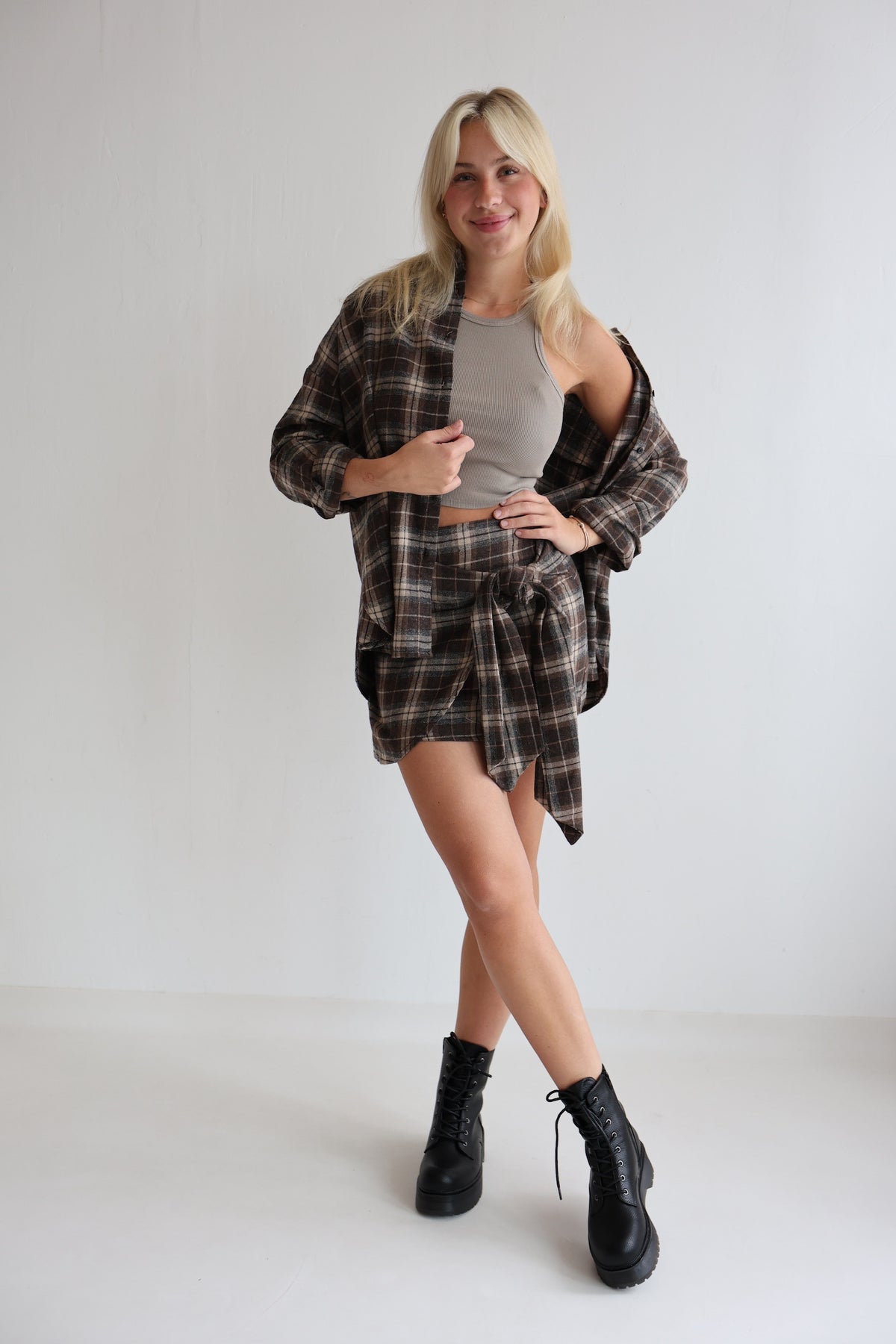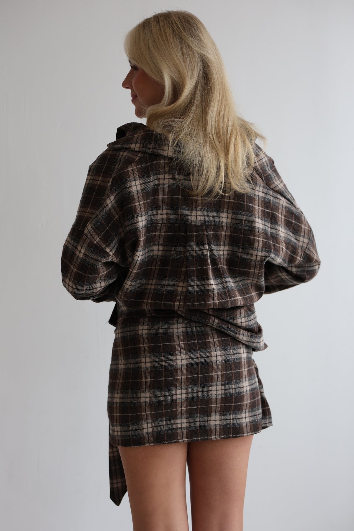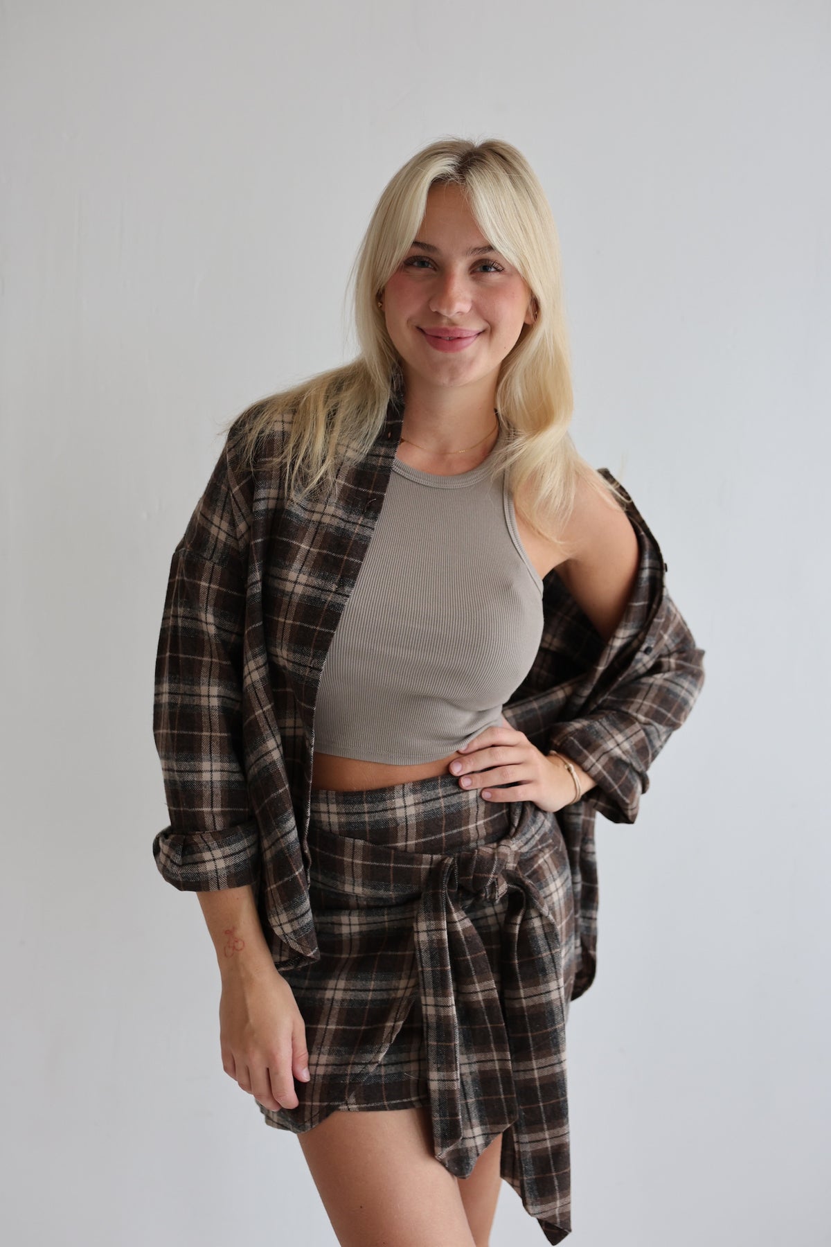 - Kurzer karierter Rock mit Knoten