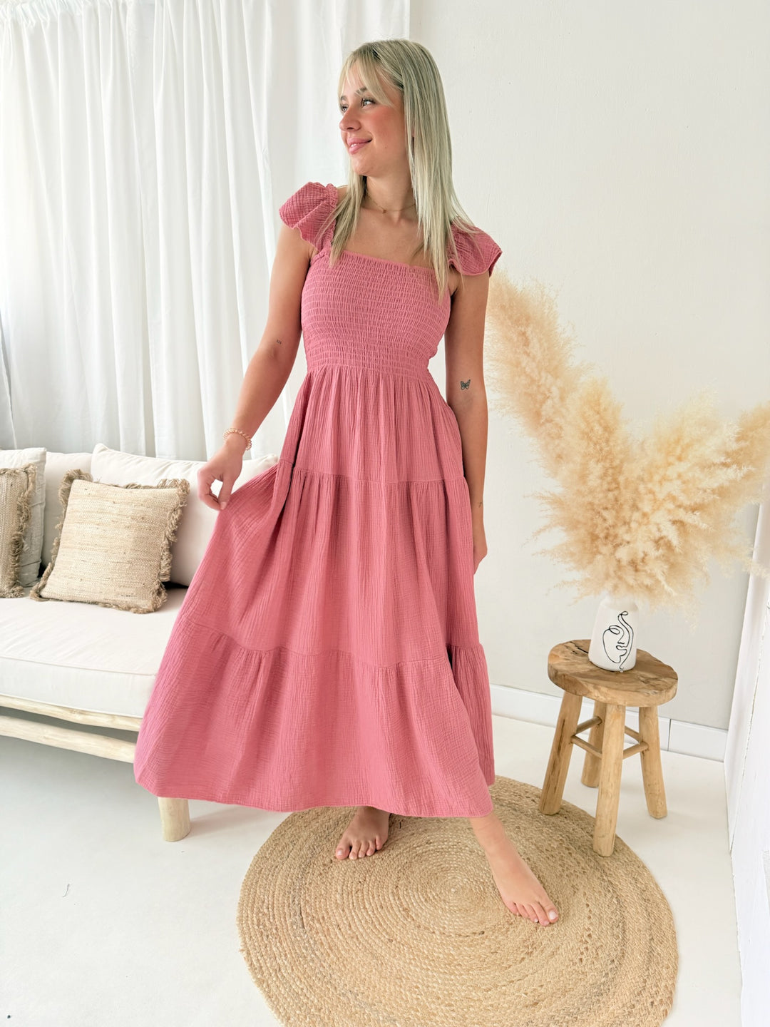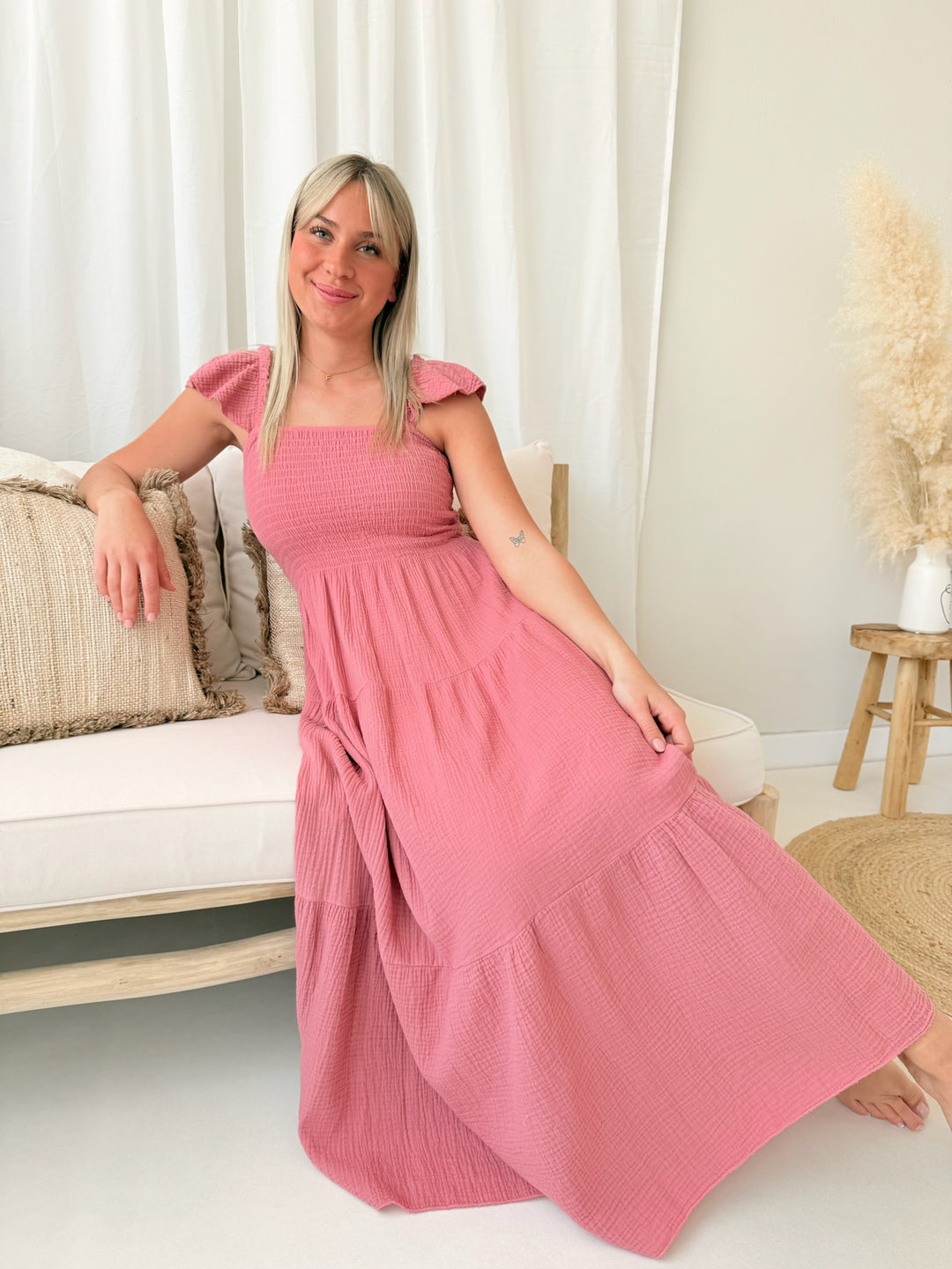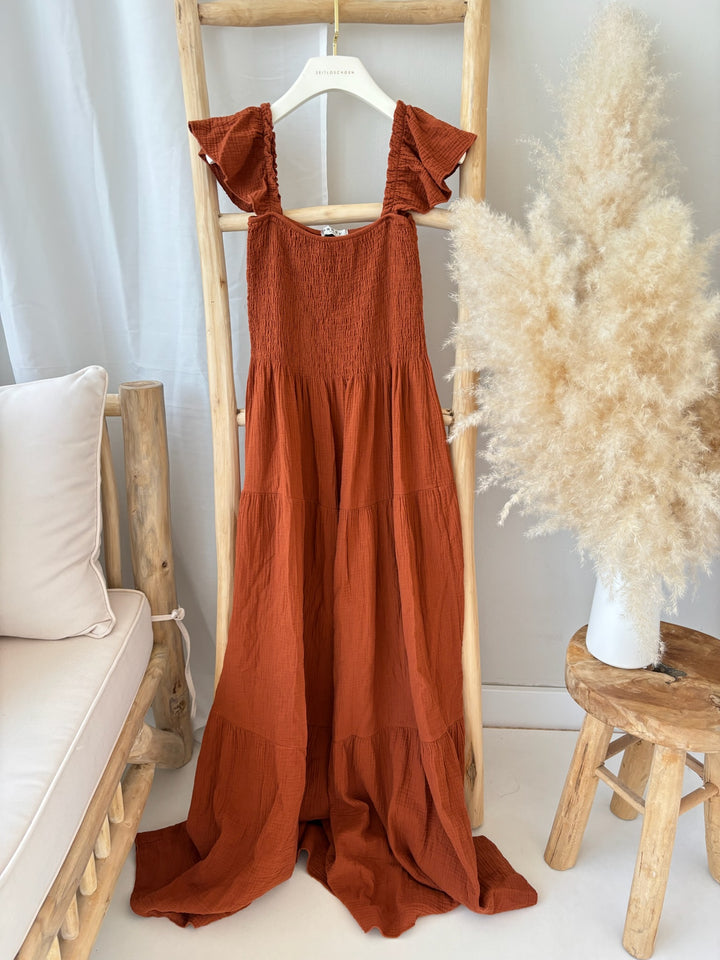 • wunderschönes langes Musselinkleid mit Raffung und Rüschenärmeln