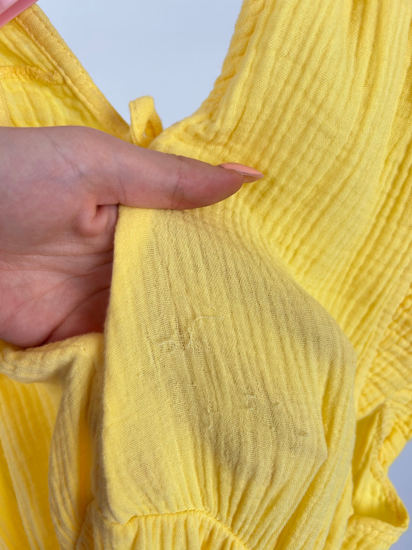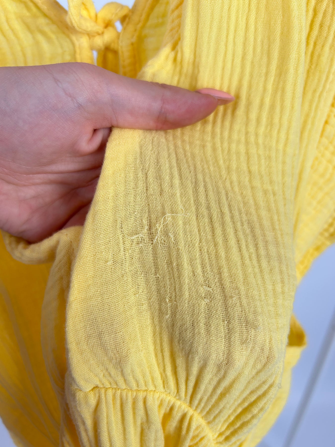 • auf der Vorderseite sind leichte Fädchen gezogen (siehe Bild)