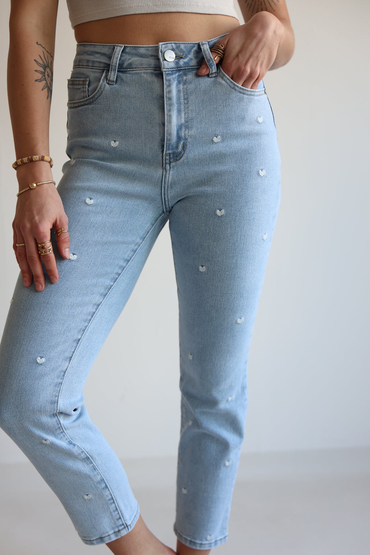 • Jeanshose mit aufgestickten Herzen